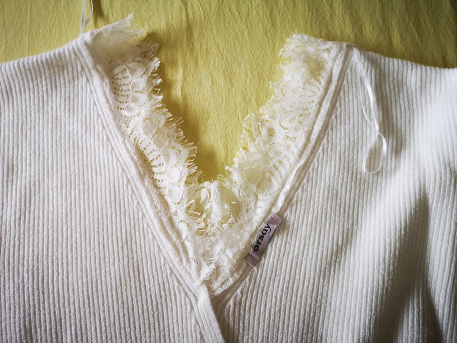 Prodam pulover ORSAY, krem/naravno bele barve. Številka M/38, spredaj in zadaj v izrez (zadaj preklopljen), obrobljen s široko čipko na obeh straneh. Nikoli nošeno.