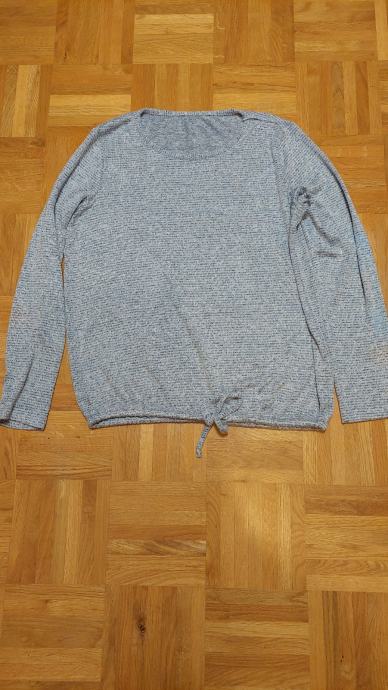 Prodam ženski pulover modre barve in spodaj ima vrvico za vezanje, listka s konfekcijsko številko nima zato je konfekcijska številka ocenjena. Dolžina puloverja je 59 cm širina pod pazduho pa 49 cm. Pulover ima eno majhno luknjico zašito.