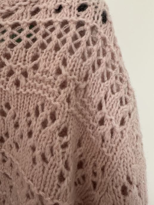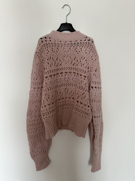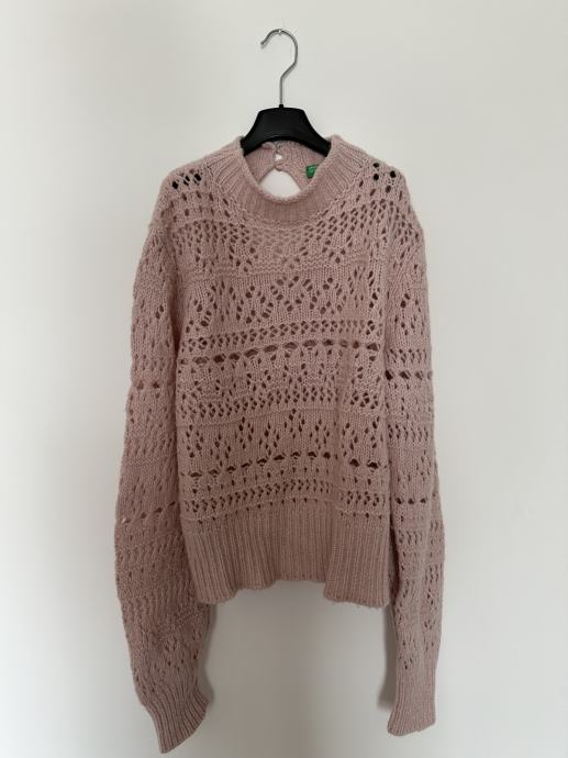 Prodam pleten pulover znamke Benetton. Med roza barvo ima vpleteno tudi zlato nitko, ki naredi lep detajl. Ovratnik je nekoliko višji, pulover se zadaj zapne z gumboma. Nikoli nošen, le opran, brezhiben.