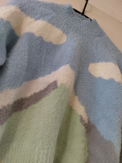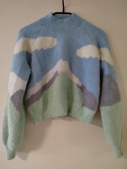 Prodam 3x nošen TALLYWEIJL pulover mehke teksture v nežnih modro-zelenih odtenkih z vzorcem oblakov. Udoben in topel pulover znamke TALLYWEIJL je idealen za hladnejše dni. V dobrem stanju, z zanimivim dizajnom, ki spominja na nebo in pokrajino.Vel*S