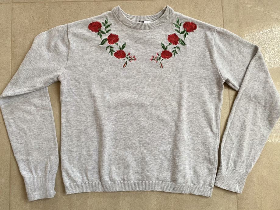 Prodam zelo lep pleten PULOVER, znamke Divided, v nežni melirano sivi barvi, z všitimi rdečimi vrtnicami v zgornjem delu spredaj. Velikost: XS.