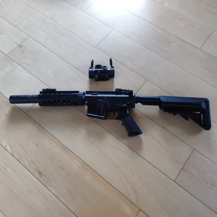 Prodajam m4 airsoft puško zaradi neuporabe. Uporabljena je bila le 2x. Zraven pride še Li-Ion baterija ter polnilec, Theta optics: Red dot z nastavljivo svetlostjo in pozicijo pike ter en nabojnik (sržer), ki pa ima prostora za 500 kroglic. Baterija je čisto nova, saj mi je prejšna nehala delovati in sem kupil boljšo, saj za to baterijo ni pomembno kdaj se jo polni (ko je čisto polna ali prazna). Puška ima dve nastavitvi streljanja: Auto, ki je hiter način streljanja in Semi, ki ji počasen način saj je treba za vsak metek pritisniti sprožilec. Puška ima tudi nastavljivo kopito, kar pomeni, da je narejena za manjše in večje posameznike. Puška je delno iz kovine ima pa kakšne detaile iz plastike za boljše udobje. Ogled in prevzem je možen tudi: Ribnica-Ljublana Rudnik in Ribnica-Postojna.