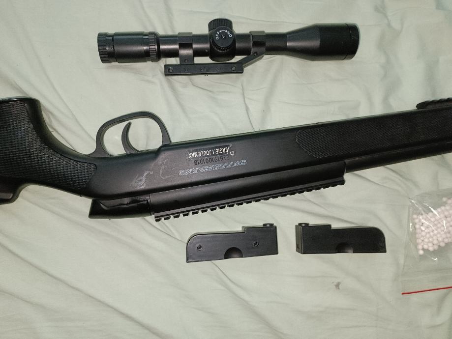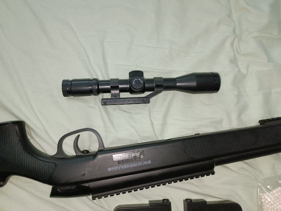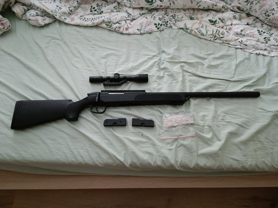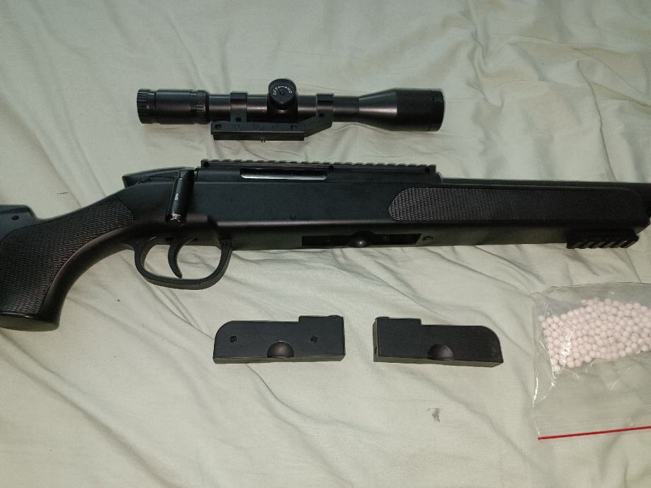Zraven ima original scope z red dot, dva nabojnika in nekaj BB kroglic.