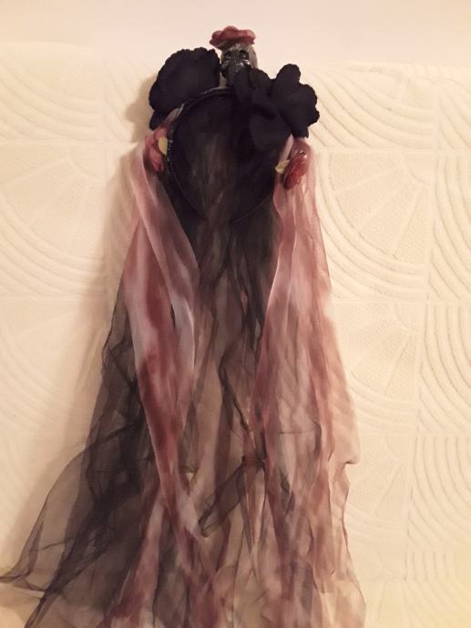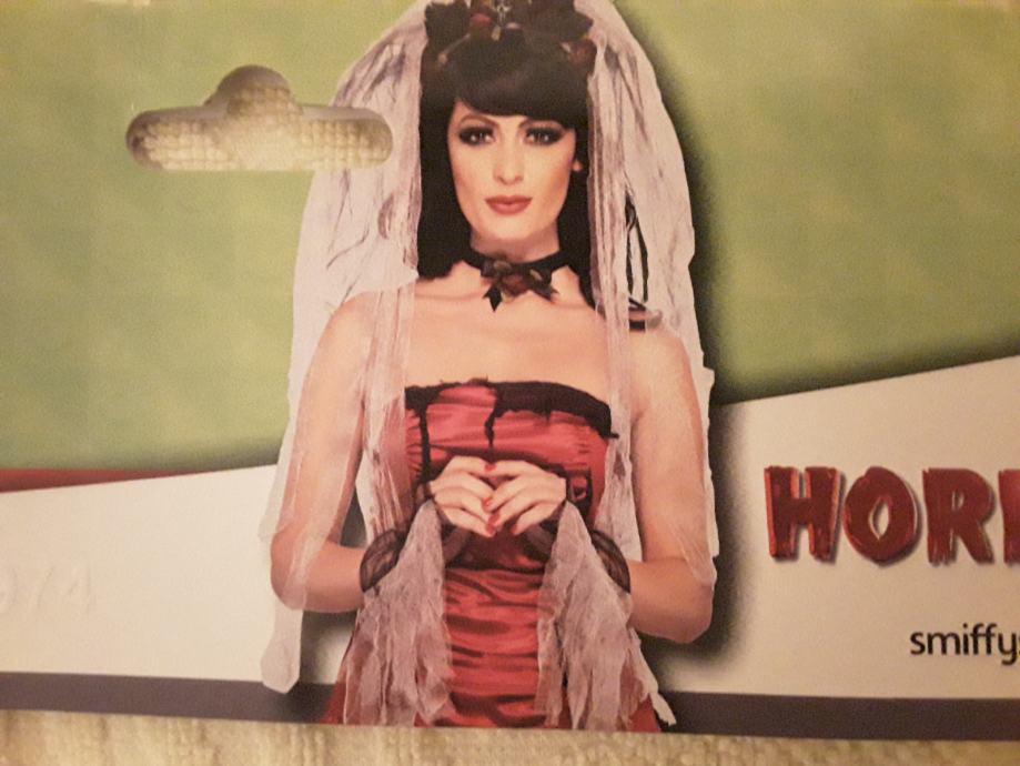 Gotska nevesta, tančica z obročem, ogrlica, rokavice; kupljeno v Angliji in enkrat uporabljeno.
