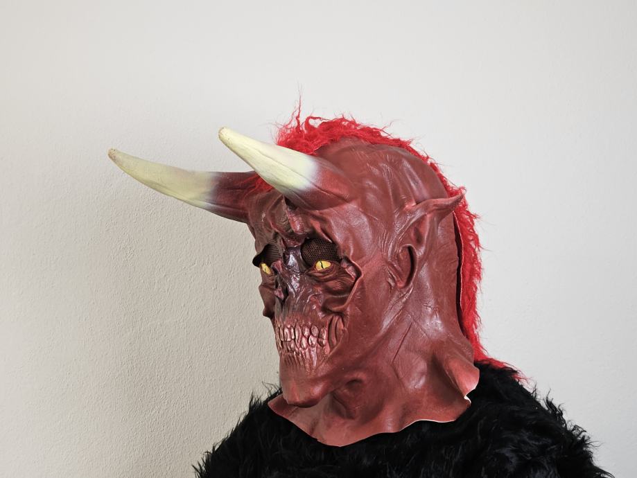 Maska je izdelana iz lateksa, plastike in umetnega krzna.