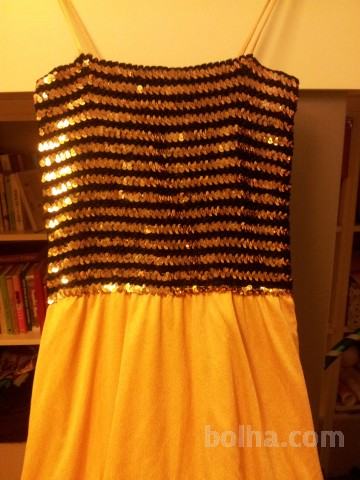 Obleka z oprijetim životcem iz bleščic (sequinsov), od koder se razpostre rumeno zvončasto krilo. Glede na barve je obleka odlična za masko čebele, lahko pa jo nosite kar tako :)