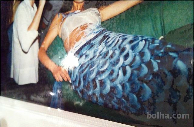 Prodam ročno poslikan rep morske deklice na raztegljivi tkanini, ki je viden na fotografiji v tem oglasu, kar se obleče kot ozko krilo do pasu in na koncu ima manjšo oblikovano plavutko iz blaga.