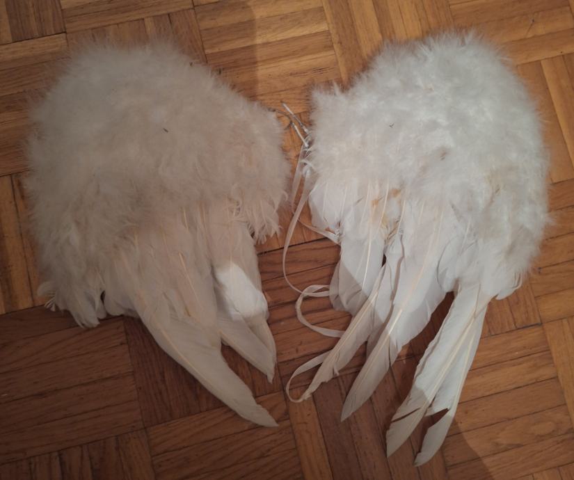 Angelska krila, ki so poškodovana, namenjena za DIY (3€), kapica z roza uhicami (1€), rjavi šal z rožnim motivom (4€), mreže za fige (3€), rdeča kapica za kostum palčka (3€), trak za lase z zvezdico (1€), trak za lase (2€), lasulji sta precej poškodovani, zato jo prodam po simbolični ceni 50 centov.