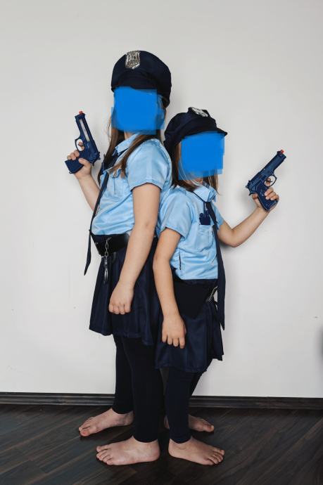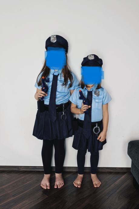 Kostum (na sliki leva deklica) vsebuje: obleko, kapo, kravato, pas, lisice, plastično pištola + doma narejen tok, voki-toki, izkaznico