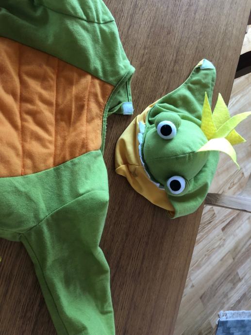 Prodam pustni kostum zmajček, velikost 2-3 leta, sestavljen iz oblekice in kape, ki se pritrdi pod brado z ježkom.