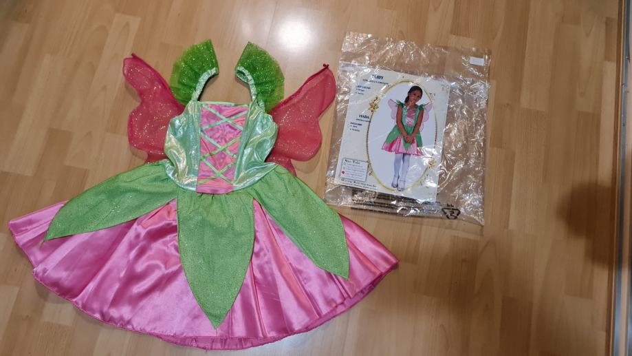 Zelo lepo pustni kostum metuljcica oz. vilinska princeska, kot nov. Imela je le 1x oblecenega. Krila in oblekica ima cez izgled blescic (je tako blago, ne gre za blescice,ki bi padale dol).