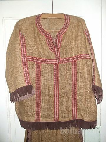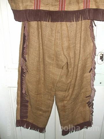 Otroški pustni kostum indijanec, lepo izdelan, ročno delo, material juta in pravo usnje, velikost 10-12 let, dolžina hlač 82cm,