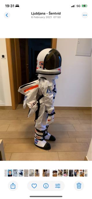Pustni kostum za odraslo osebo vsebuje obleko, rokavice in čelado - 70€. Otroški pustni kostum v velikosti 6-8 let vsebuje obleko, rokavice, čevlje, kapo, ruzak in čelado - 130€. Oboje skupaj 200€.