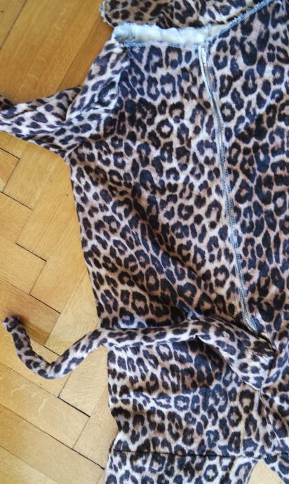 Doma narejen kostum za geparda, glava posebej z masko čez oči. Pajac ima zadaj zadrgo in prišit rep.
