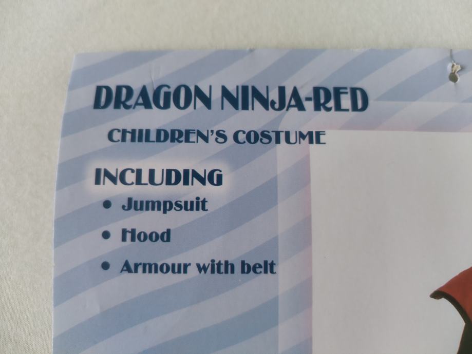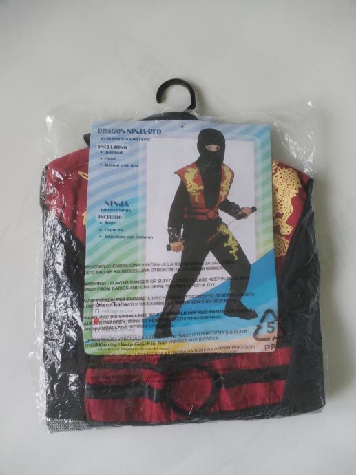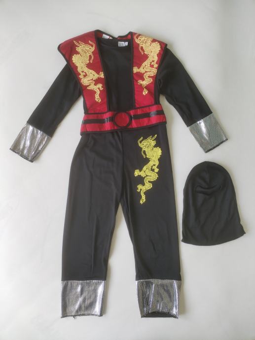Prodam rabljen, a dobro ohranjen pustni kostum Dragon Ninja za fante. Velikost M (za višino 120-130 cm). Vključuje kombinezon, črno pokrivalo za glavo in neke vrste oklep s pasom, vse troje iz blaga.