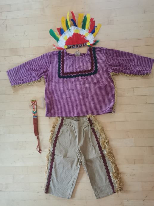 Prodam pustni kostum za maškare INDIJANEC, za 1,5-3 let, unikaten, kot nov (nošen 1x), zgornji del dolžine 50 cm, hlače v pasu na elastiko dolžine 56 cm, sekira- tomahavk in perjanica. Cena: 24 EUR + poštnina, če pošljem po pošti. Info: 041 931 831