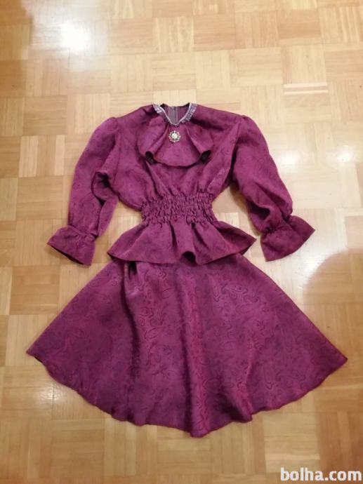 Prodamo unikatni, po naročilu izdelan komplet iz vijoličnga svilnatega blaga. Lahko se večkrat uporabi za različne maske in raste z otrokom. Vsebuje bluzo z broško in krilo. Oboje ima elastiko v pasu in zapestjih, da se lahko prilagodi velikosti otroka. Pri manjših deklicah je krilo daljše in so rokavi bolj nabrani.