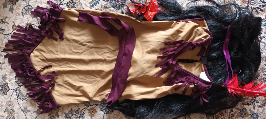 Set vključuje indijansko krilo rjave barve, črno lasuljo, pas, in trak za na glavo.