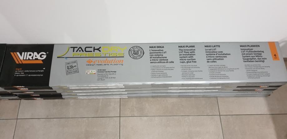 Prodam zelo kvaliteten vinil znamke Virag EVOLUTION TACKDRY PRESTIGE. Vinil je samolepilen in se ga polaga na stik, zato je polaganje zelo enostavno. Debelina vinila je 4mm in ima 0.55mm obrabnega sloja.