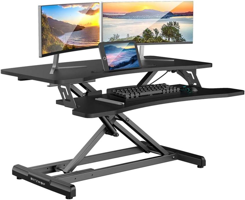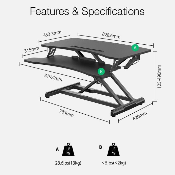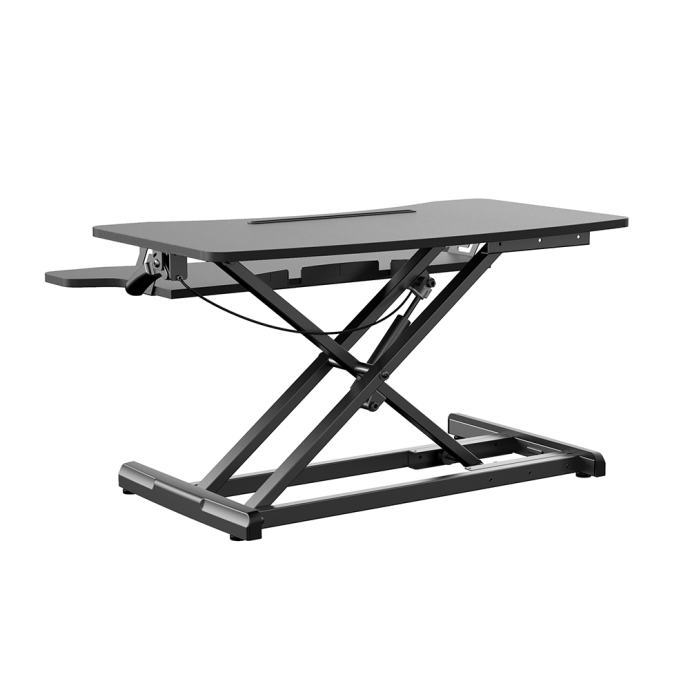 Odlična rešitev za vse, ki želijo vse prednosti stoječe mize, hkrati pa obdržite svojo mizo, ko želite delo opravljati sede oz. Ko potrebujete počitek. Miza ima tih in lahko vodljiv mehanizem, ki omogoča spuščanje in dvigovanje mize od 12 cm do 50 cm. Ima veliko delovno površino z možnostjo razporeditve 2 zaslonov, poličko za tipkovnico in režo za telefon ali tablico.