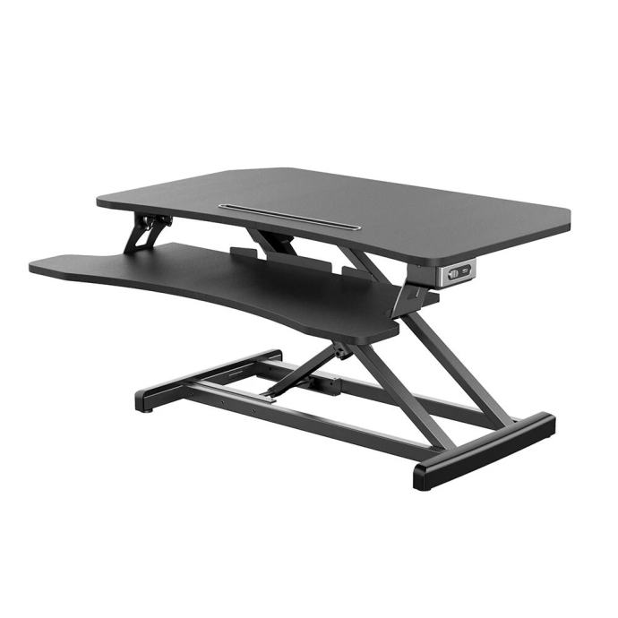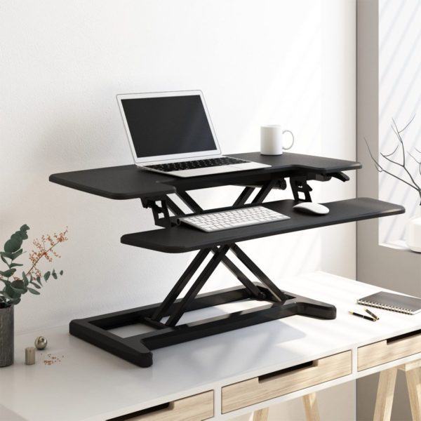 Adapter-konverter za stoječe mize (standing desk) kakovostne znamke, preprosta rešitev ki omogoča pretvorbo katere koli mize v stoječo mizo. Nastavek je mat črne barve, blikovan je tako, da se zlahka prilega tudi v kotne predele.