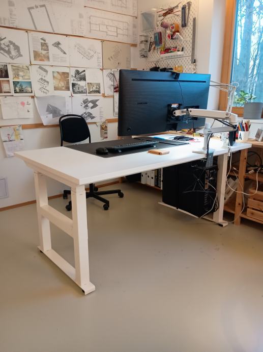 Prodam izjemno kvalitetno dvižno mizo Ergomaster WTR01, dimenzij 90 x 160 cm. Višina mize je nastavljiva v razponu 71-120cm. Ogrodje je masivno kovinsko, prašno barvano v beli barvi. Delovna površina je iz 3 cm debele iveral plošče. Mizo ima 4 motorizirane noge, ki tudi v najvišjem položaju zagotavljajo stabilnost (večina dvižnih miz ima 2 motorja in so v iztegnjenem položaju precej majave). Maksimalna obremenitev mize je 250kg kar omogoča tudi kakšna zahtevnejša specializirana dela. Miza je proizvedena v Evropi. Pri proizvajalcu Ergomaster je možno dokupiti še kakšne dodatke. Prodajam zaradi preurejanja poslovnega prostora. Cena nove mize s poštnino je prek 1000€.