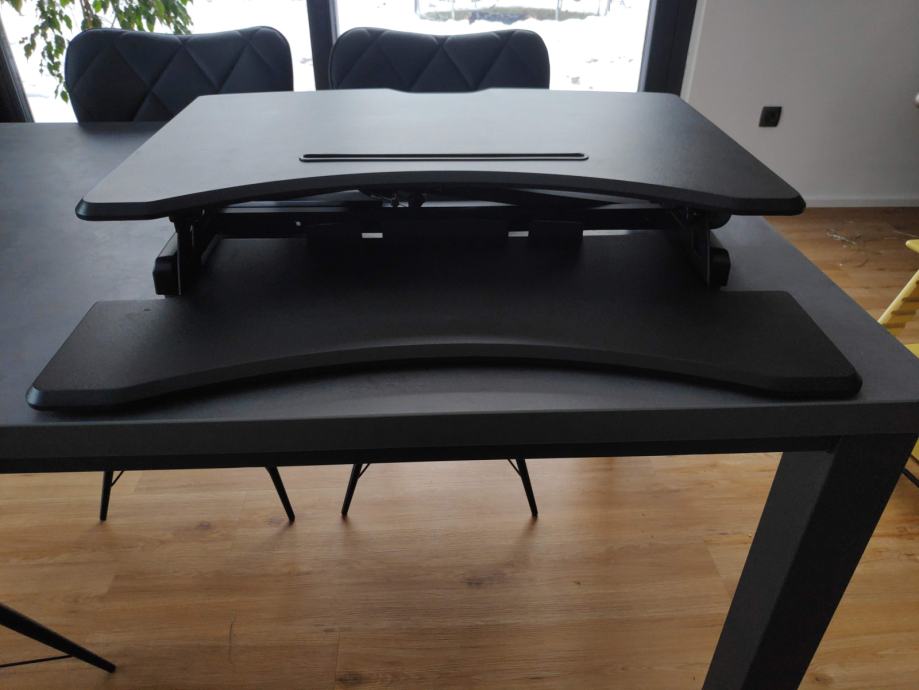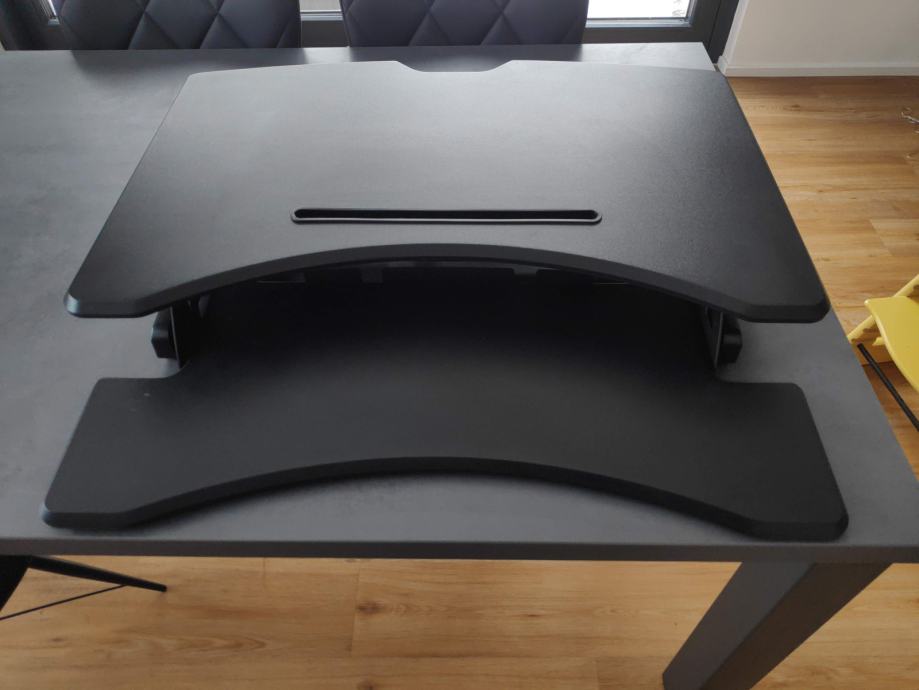 Dodatek je namenjen obstoječi fiksni pisalni mizi in tako omogoči delo v stoje. Je dovolj trdna za delo in skoraj nima sledov uporabe. Uporabljena je bila cca 6 mesecev, kupljena pa eno leto nazaj. Ima pnevmatični mehanizem za dvigovanje in spuščanje.