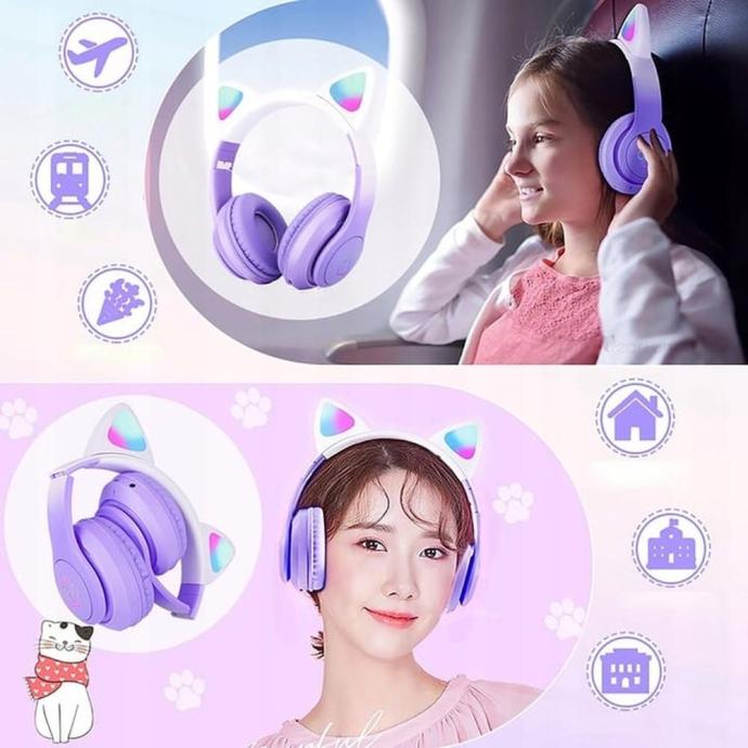 Bluetooth slušalke z mačjimi ušesi imajo številne funkcije, ki so uporabne pri vsakodnevni uporabi. Če se baterija v slušalkah izprazni, jih povežite s katerimkoli mikro-jack kablom in poslušajte naprej! Ni pomembno – svojo najljubšo glasbo lahko vzamete s seboj na kartici SD, ki jo lahko vstavite in predvajate neposredno v slušalkah.Brezžične slušalke z mačjimi ušesi so popoln pripomoček za vsakega otroka! Udoben dizajn, odlična kakovost zvoka, veliko število funkcij in MAČJA UŠESKA, ki se svetijo v različnih barvah, naredijo naše Bluetooth slušalke popoln predlog za vsakega mladega ljubitelja glasbe.