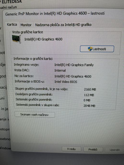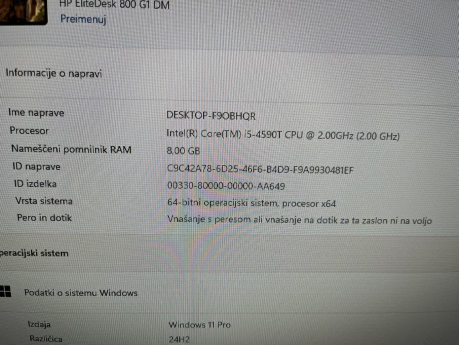 računalnik HP Elitedesk I5, 220 GB disk SSD, RAM 8 GB, še ena prosta reža.