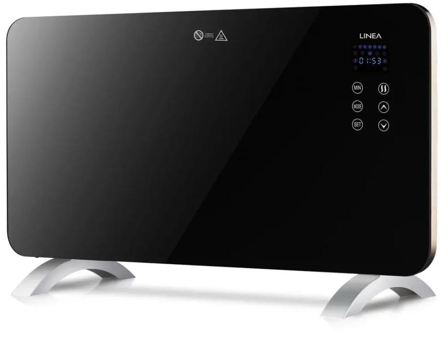 Električni konvektorski grelnik s stekleno ploščo LINEA LEG-0522, moč 1500 W, daljinski upravljalnik. Primeren za namestitev na steno ali samostoječ (priložene noge). Kovinsko ohišje z elegantno črno stekleno ploščo v prednjem delu.