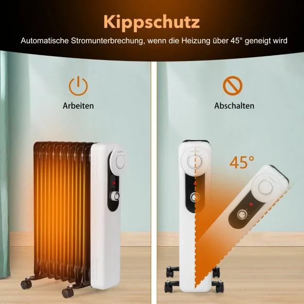 Celovita varnostna zaščita: grelna rebra so trajno zaprta, tako da vam ni treba skrbeti za puščanje. Poleg tega je oljni grelec opremljen z zaščito pred pregrevanjem in prevračanjem. Samodejno se izklopi, da se izogne nevarnosti požara, ko je nagnjen do ali do 45°, kar je prijazno in varno za družine z otroki in hišnimi ljubljenčki.