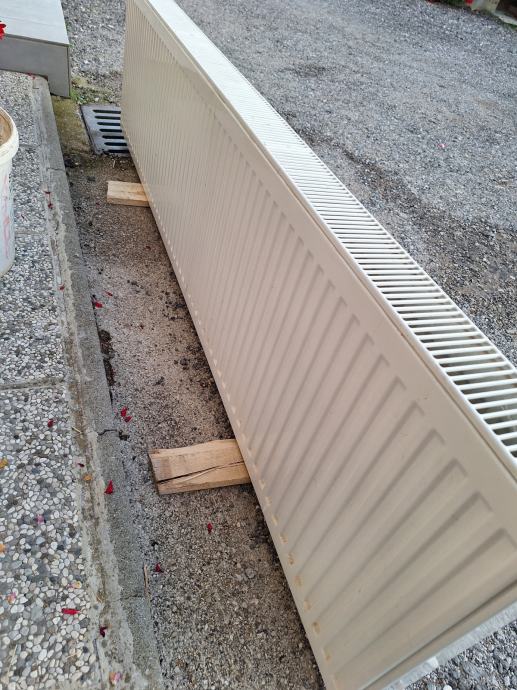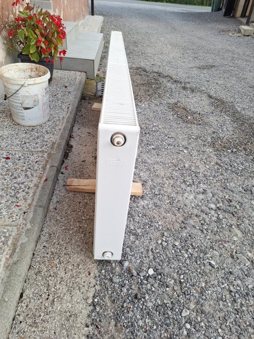 Radiator znamke DeLonghi, bele barve, dimenzije 200 cm x 50 cm x 10 cm.