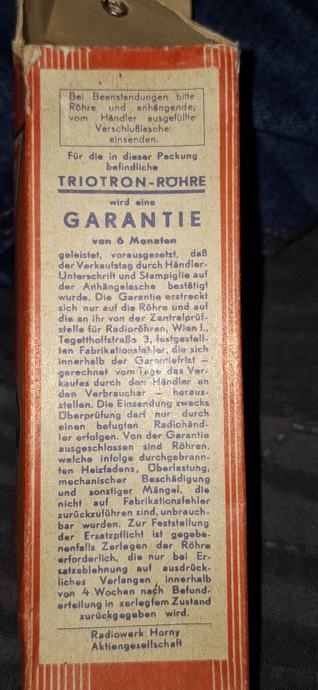 V primeru reklamacij pošljite cev in priloženo tesnilno loputo, ki jo je izpolnil prodajalec. Za CEVI TRIOTRON v tej embalaži velja GARANCIJA 6 mesecev, pod pogojem, da je datum prodaje potrjen s podpisom in žigom prodajalca na viseči loputi. Garancija velja samo za cev in proizvodne napake, ki jih je ugotovil Centralni preskusni center za radijske cevi, Dunaj 1, Tegetthoffstrasse 3, in so bile odkrite v garancijskem roku, ki se šteje od datuma prodaje s strani prodajalca potrošniku. Cev lahko v pregled pošlje le pooblaščeni prodajalec radijskih naprav. Iz garancije so izključene cevi, ki so postale neuporabne zaradi pregorele nitke, preobremenitve, mehanskih poškodb ali drugih napak, ki niso posledica proizvodnih napak. Za določitev odgovornosti za zamenjavo je lahko potrebna demontaža cevi. Če zamenjava ni dovoljena, bo cev vrnjena razstavljena le na izrecno zahtevo v štirih tednih po pregledu. Radiowerk Horny Aktiengesellschaft