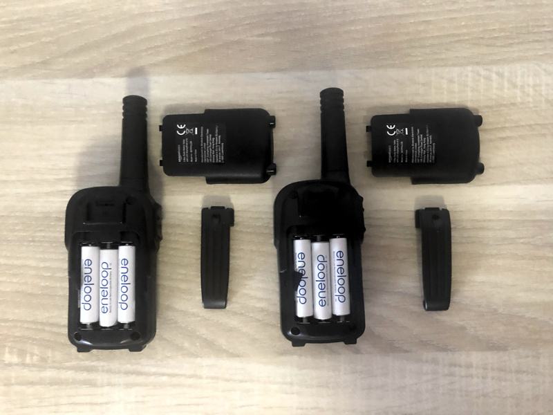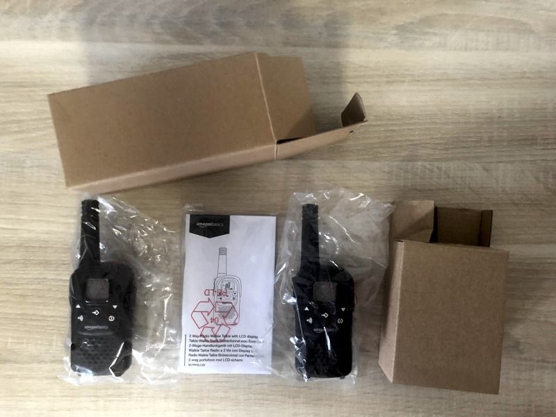 Komplet Amazon Basics PMR Walkie Talkie-ja na AAA baterije. Praktično nerabljeno. Baterije niso vključene.