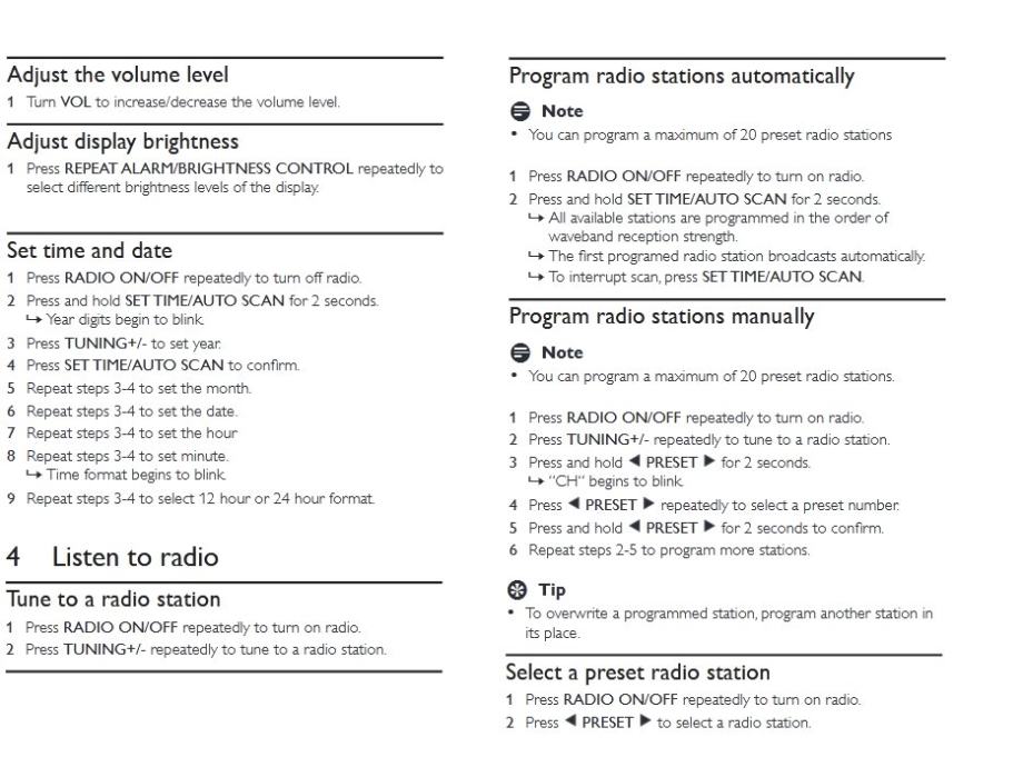 Radio z digitalnim iskanjem FM postaj, 20 postaj lahko shranimo v spomin (poiščemo FM postajo, pridržimo gumb PRESET, začne utripati 'Ch', pritiskamo PRESET, da izberemo številko spomina, spet pridržimo gumb PRESET za 2 sekundi in FM postaja se shrani v spomin).