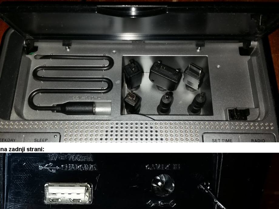 Polnjenje telefona, iPoda ipd. - medtem, ko spimo, lahko polnimo telefon - ali preko priloženih adapterjev (za stare Nokia, Ericsson, Motorola, Samsung telefone in naprave z mini USB trapezastim priključkom), ali pa preko klasične USB vtičnice na zadnji strani naprave (napis ob USB vtičnici: 5V DC 700mA CHARGING) - lahko polnimo preko adapterjev in te USB vtičnice HKRATI (polnimo hkrati 2 napravi).