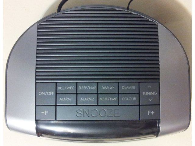 Radio je z digitalnim prikazom, postaje išče samodejno (daljši pritisk na gumb TUNING + ali -, nato spustimo) ali jih iščemo ročno s pritiskanjem na gumb TUNING. Lahko shranimo do 20 radij. postaj v spomine (poiščemo željeno postajo, pritisnemo gumb MEM/TIME, z gumboma P- oz. P+ izberemo št. spomina, pritisnemo gumb MEM/TIME).