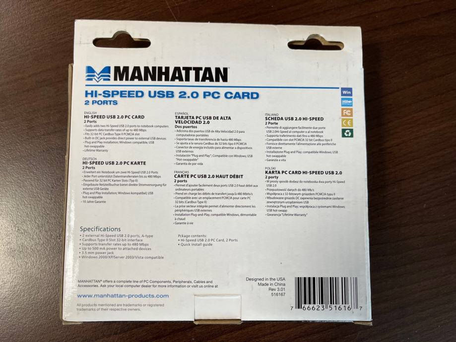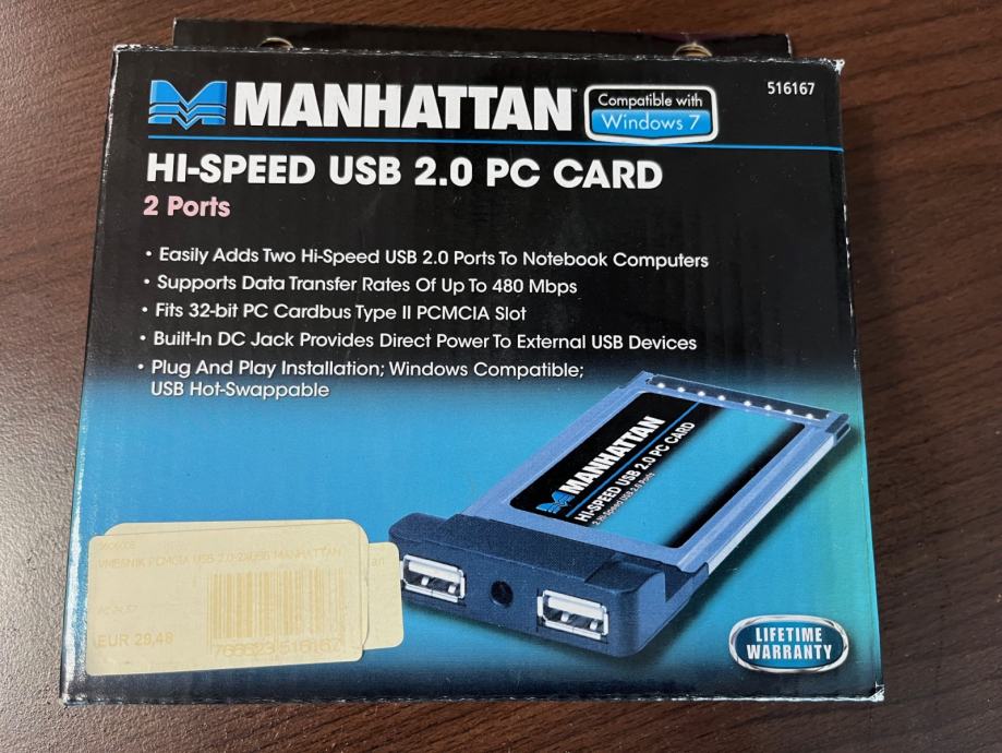 Prodam originalno zapakiran Manhattan Hi-Speed USB 2.0 PC Card. Ta kartica omogoča dodajanje USB 2.0 vrat vašemu prenosniku, kar povečuje zmogljivost in omogoča hitrejši prenos podatkov.