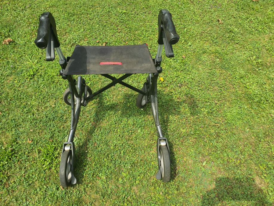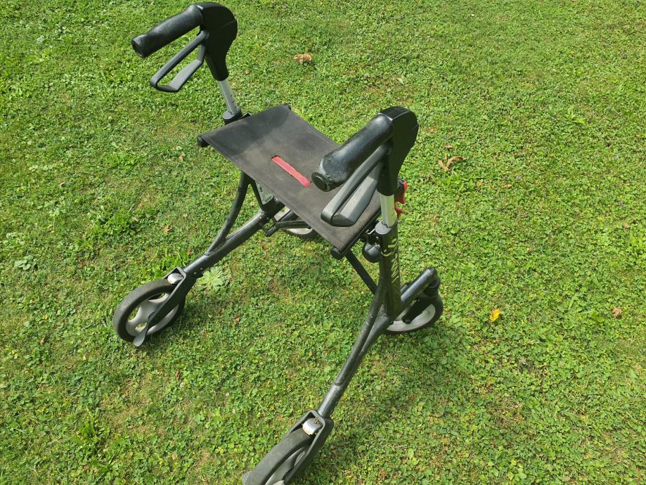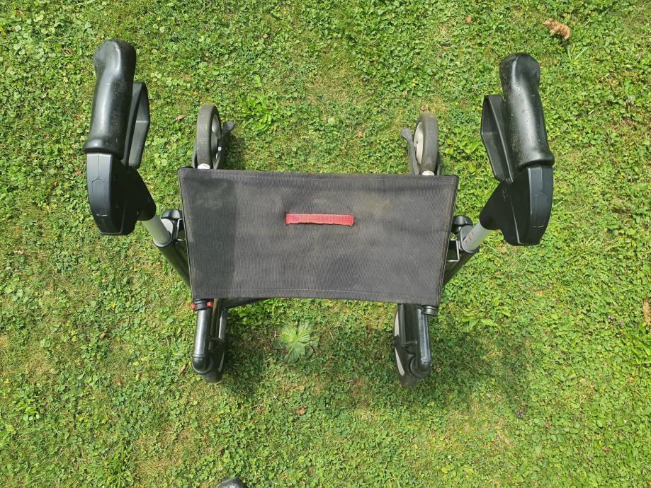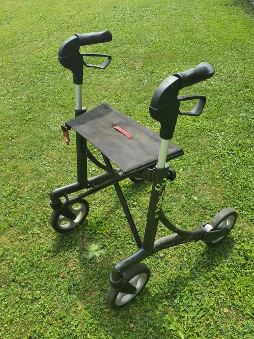 Rolator / hojca z večjimi kolesi, zavoro in sedalom. Dobro vodljiva in stabilna. Zložljiva.
