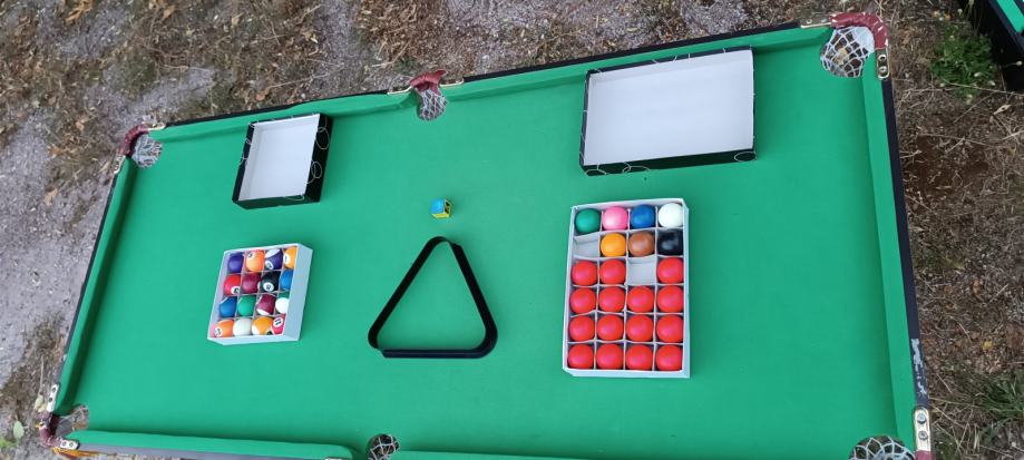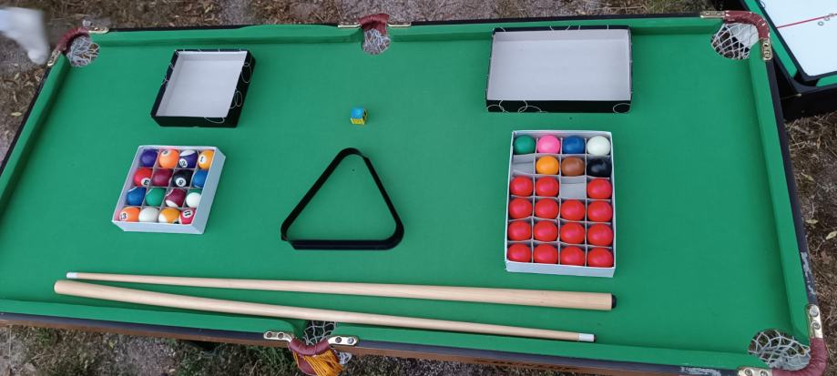 Oprema kot na sliki (dve palici, kreda, biljard krogle in snooker krogle ter trikotnik)