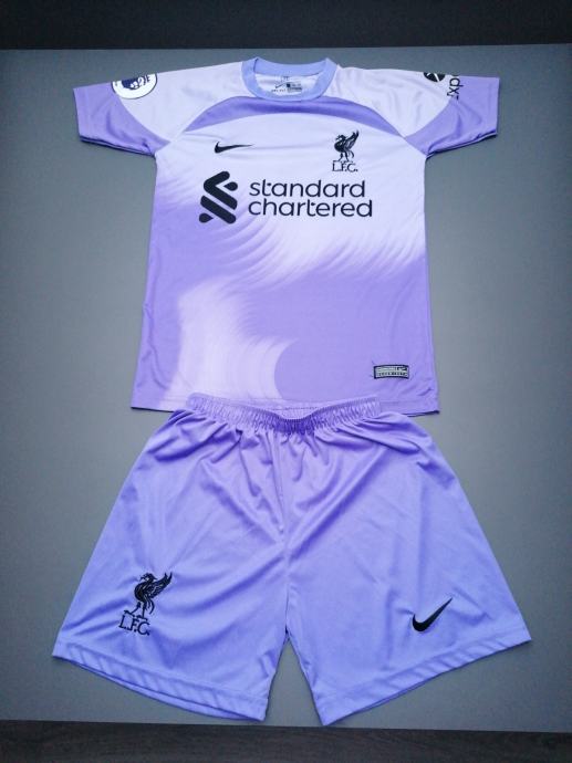 Nogometni dres v vijolični barvi, znamke NIKE. Popolnoma ohranjen. Dolžina majice je 71 cm, od pazduhe do spodnjega roba pa 40 cm. Dolžina hlačk je 34 cm.