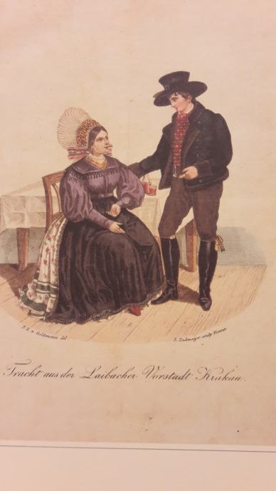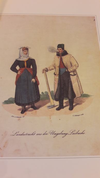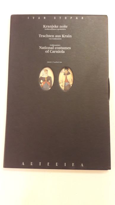 Mapa vsebuje 12 barvnih kartonskih reprodukcij krajnskih narodnih noš. Velikost slik 34x46, galerijska izdelava.