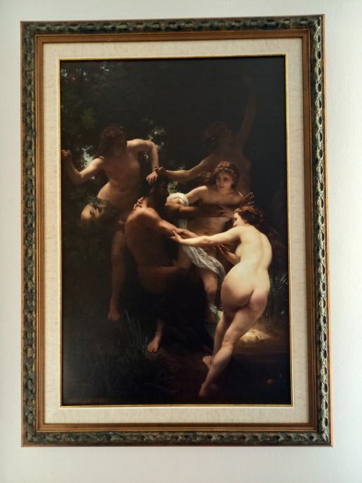 Prodam prvovrstno uokvirjeno reprodukcijo tiskano na platnu " Nimfe in Satir " ( slikar Adolphe-William Bouguereau) dimenzije 52cm x 72cm. Original se nahaja v Clark Art Institute, Massachusetts, ZDA.