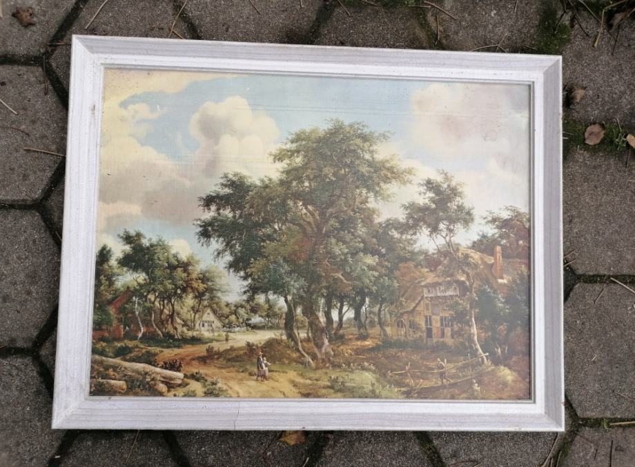 SLIKA na lesonitu v širokem debelem okvirju brez stekla 66 x 51 cm KOČA.