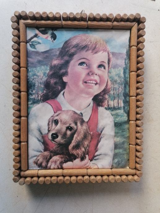 Na voljo je SLIKA v zanimivem lesenem okvirju brez stekla 17 x 22 cm DEKLICA S KUŽKOM.