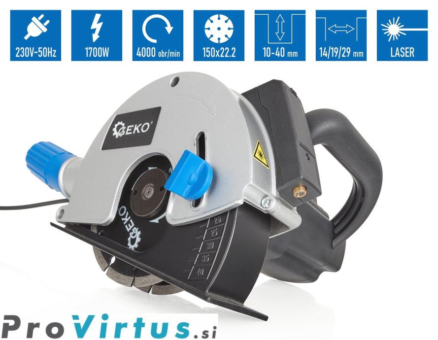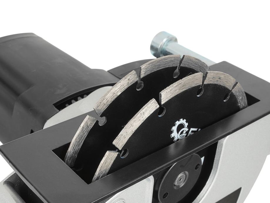 Naprava omogoča vgradnjo dveh diamantnih rezil dimenzij 150×1,9×22,2 mm. Dve rezili, ki delujeta hkrati, omogočata hitrejše in učinkovitejše ustvarjanje utorov v primerjavi z orodji z enim rezilom. To omogoča, da se delo na večjih površinah zaključi veliko hitreje. Poleg tega dve rezili omogočata ustvarjanje vzporednih utorov z enakomerno širino, kar je ključnega pomena za projekte, ki zahtevajo natančnost. Z dvema reziloma se postopek rezanja porazdeli med njima, kar zmanjša obremenitev enega rezila in poveča vzdržljivost orodja.