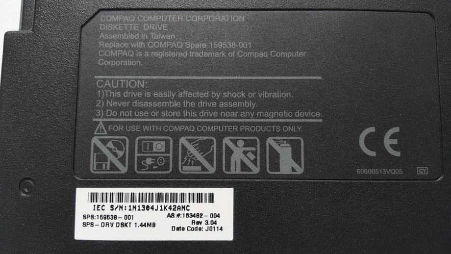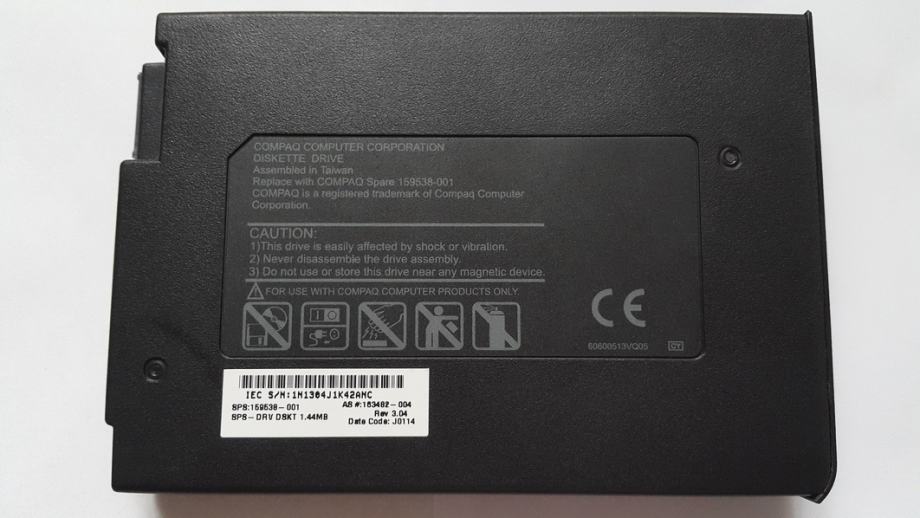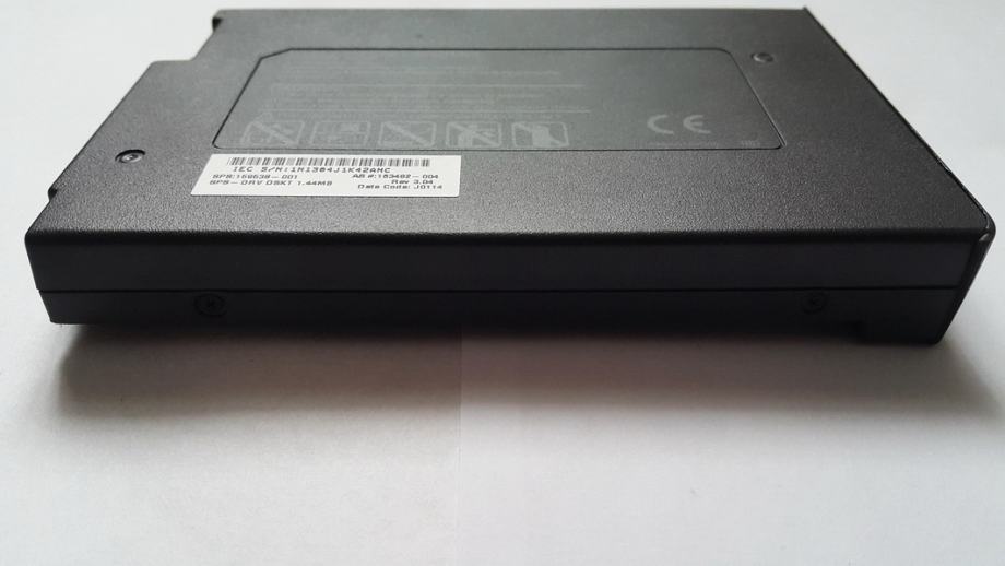 Prodam HP-jevo 1,44 MB disketno enoto za prenosnika, model 159538-001. Zadevo sem našel med pospravljanjem. Ne vem ali deluje ali ne, ker nimam tako starega prenosnika, da bi to preveril. Tako da se načeloma prodaja kot delujoča, a če se ugotovi, da temu ni tako, vrnem denar (kot se pač spodobi). Najbolje (če je le možnost), da nekako to preverimo ob osebnem prevzemu. Pač v prenosniku imejte napolnjeno baterijo ali vtični polnilec s sabo in v kakšni kavarni preizkusimo (ko enoto vstavimo v prenosnik in kakšno disketo v disketnik). Ohišje enote je videti še celo oz. plastika ni nič kaj razbarvana ali kaj podobnega. Reč že čaka na svojega novega (retro) lastnika.