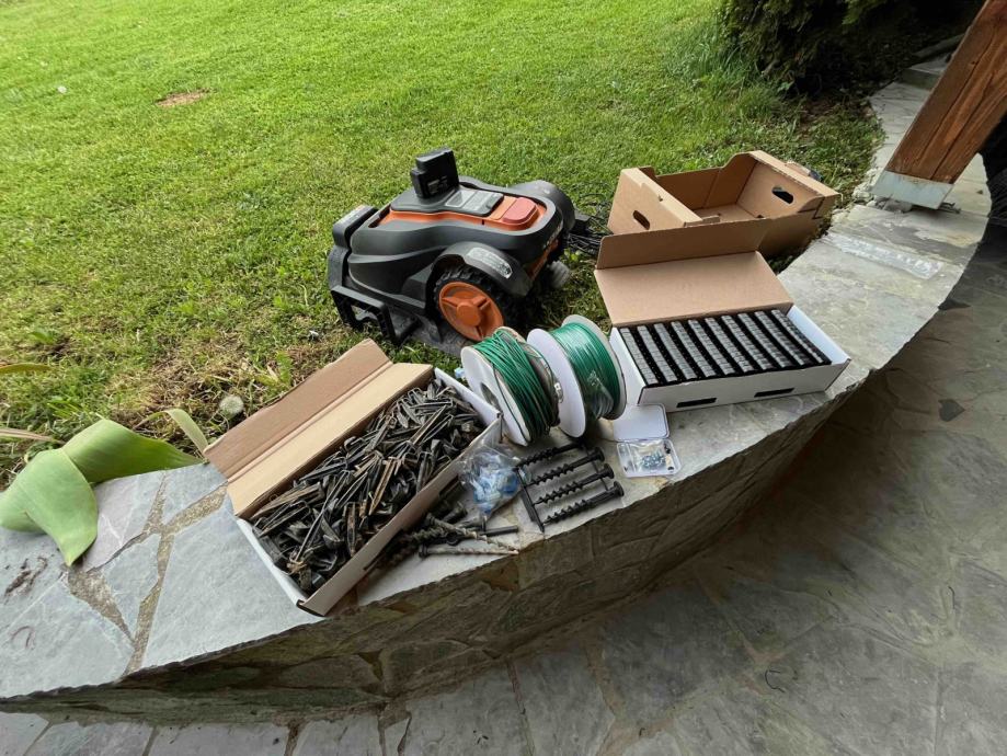 Imam pa še en kup ostalega materiala za robotske kosilnice (veliko obmejne žice, raznorazne sponke, rezila, kaveljčke za pritrditev obmejne žice). Nekaj je popolnoma novo in zapakirano.