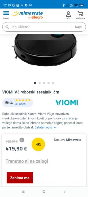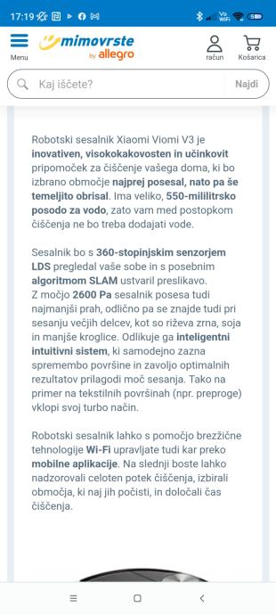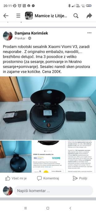 Prodam robotski sesalnik Xiaomi Viomi V3. Sesalnik se prodaja zaradi neuporabe. V kompletu z originalno embalažo in navodili vsebuje 3 zelo prostorne posode ( za sesanje, pomivanje in hkratno sesanje+pomivanje). Je brezhibno delujoč, še nikoli ni bil na popravilu. Starost: 2 leti. Priloženih tudi več krp. Je zelo natančen in ni preglasen, lahko se preklopi v tišji način. Možnost vodenja z aplikacijo preko wifi. Več karakteristik v fotografiji. Info: 051/ 640- 620