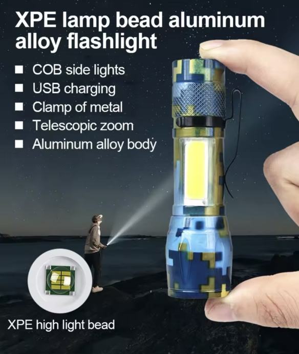 Prodajam novo LED svetilko z dolgim dosegom, ki omogoča osvetlitev do 300m. Svetilka ima T6+COB tehnologijo in je polnljiva preko USB priključka. Gre za taktično svetilko z multifunkcijskimi možnostmi, popolnoma nova in nerabljena.